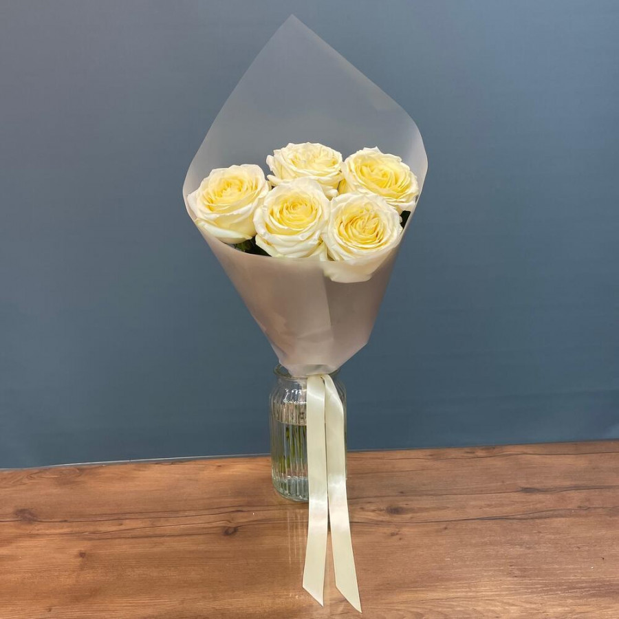 На фото 5 кремовых роз. В составе: роза 5 шт, дизайнерская упаковка 1 шт, атласная лента 1 шт, . Все цветы свежие и ароматные, букет красиво оформлен и отлично подходит для подарка. Доступна доставка цветов или самовывоз.
