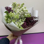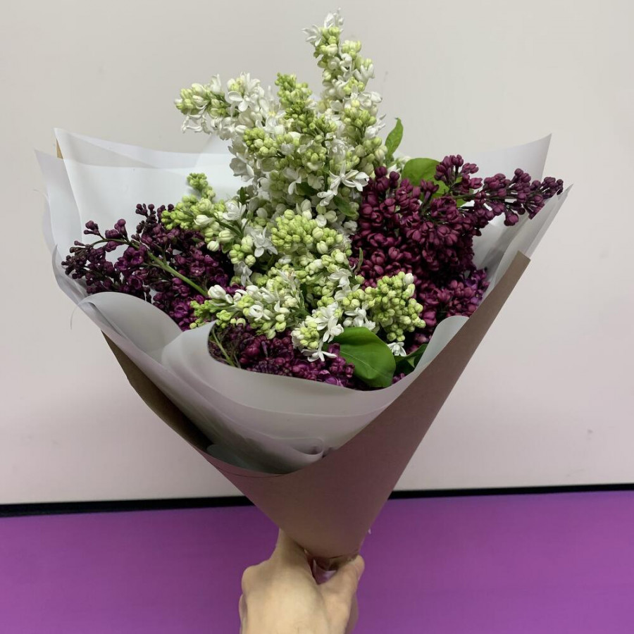 На фото букет из белой и фиолетовой сирени. В составе: сирень 9 шт, крафт-бумага 1 шт, атласная лента 1 шт, . Все цветы свежие и ароматные, букет красиво оформлен и отлично подходит для подарка. Доступна доставка цветов или самовывоз.