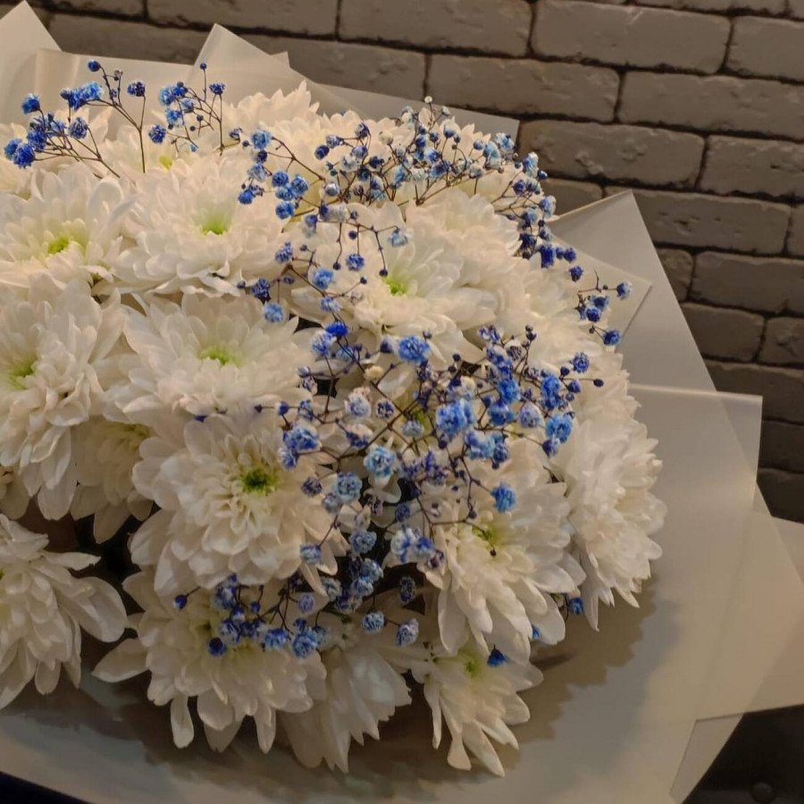 На фото букет из белых хризантем и гипсофилы. В составе: хризантема кустовая 5 шт, гипсофила 2 шт, крафт-бумага 1 шт, атласная лента 1 шт, . Все цветы свежие и ароматные, букет красиво оформлен и отлично подходит для подарка. Доступна доставка цветов или самовывоз.