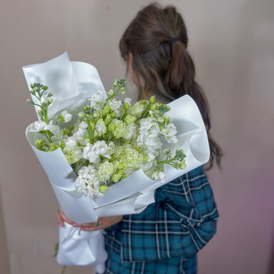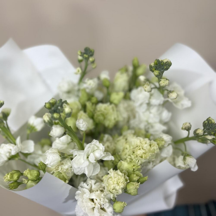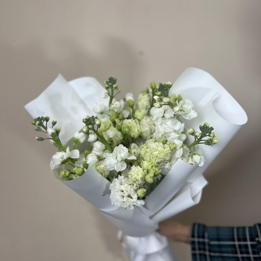 На фото букет из белых матиол и эустом. В составе: эустома (лизиантус) 7 шт, маттиола 5 шт, дизайнерская упаковка 1 шт, атласная лента 1 шт, . Все цветы свежие и ароматные, букет красиво оформлен и отлично подходит для подарка. Доступна доставка цветов или самовывоз.