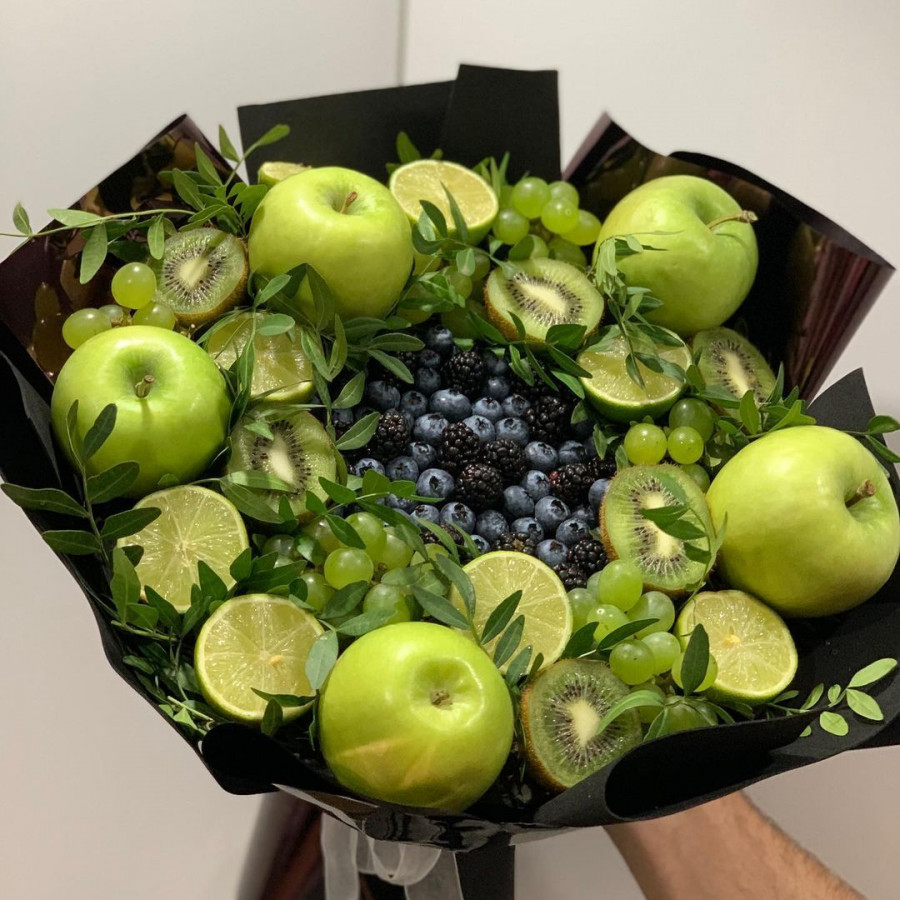 На фото букет с черникой. В составе: черника 1 шт, ежевика 1 шт, виноград (зеленый) 1 шт, лайм 3 шт, киви 3 шт, яблоко 5 шт, писташ 2 шт, крафт-бумага 1 шт, атласная лента 1 шт, . Все цветы свежие и ароматные, букет красиво оформлен и отлично подходит для подарка. Доступна доставка цветов или самовывоз.